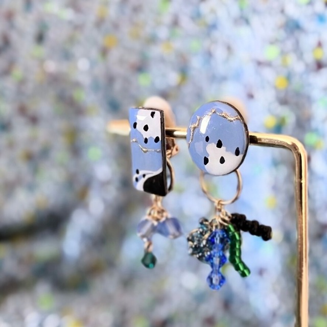 雫型の耳飾り 朝露と夜露の アシンメトリーイヤリング/ピアスです。 さわやかな朝露の雫 …葉っぱの色が映り込んだような、ターコイズグリーンの立体的な雫。 しっとりとした夜露の雫 …月の光が輝くような重なり合う雫。 お顔周りもつやつやしっとりみずみずしく✦ 朝露の立体部分や、夜露の光る大きさ等は作品ごとにそれぞれ個体差があります。 雫を通して見える景色がその日その瞬間に違うように、世界にひとつをお楽しみください! ・イヤリング/ピアスをお選びください utane+の耳飾りは、揺れるビーズもポイントになっています。 朝露、夜露に合わせてエモく組み合わせています。 これから始まる一日がわくわくするような朝露に付いた夜明けのビーズ。 楽しかった今日を振り返り眠りについた夜露に付いた穏やかなビーズ。 イヤリングのビーズは取り外し可能な金具に付いています。ピアスのビーズはキャッチに取り付けました。 【素材】 プラバン、ビーズ、レジン等 イヤリング:板バネイヤリング(ゴムカバーは取れやすいので着脱の際はご注意くださいませ) ピアス:サージカルステンレスピアス 【ベース部サイズ約】 縦1.7cm位 多少のばらつきがあります。 *着画は私物を使用しています … utane+の耳飾りは、 ベース部をひとつひとつ手描きデザインしています。 甘辛ミックス、甘シック…大人カラフルなアクセサリーを制作しています。 お時間がございましたら、是非プロフィールも覗いてみてください。 … 以下ご確認の上お手続きにお進みくださいませ。 ・ひとつひとつペイントしている為、ラインの長さやドットの大きさ、位置等には個体差があります。世界にひとつをお楽しみください。 ・使用するビーズは、在庫の確保が難しい場合等、全体のイメージを損なわない程度に変更する場合があります。 ・味のある歪み、気泡等がある場合がございます。 また、ビーズには元々の小さな傷、凹み、ムラ等があるものがございます。 ・金具やビーズは 汗、皮脂、化粧品、経年変化等により変色します。ご使用後は柔らかい布等で優しくお手入れする事をおすすめします。 ・ご利用のパソコンやスマートフォン、また撮影時の環境により、実際の色味と異なって見える場合がございます。 ・お客様都合による 返品・交換はお受けできかねます。ご相談くださいませ。 ・発送まではお支払い確認後から土日祝日を除く10日程いただいております。 ・厚さ3cmの小型段ボールにて発送となります。通常郵便受けへのお届けとなりますが、入らない場合は手渡し(ご不在の場合は不在票)となります。お受け取りをお願いいたします。 *** しずく ドロップ 雨 梅雨 個性 2way ビーズ タッセル ギフト 紫陽花カラー utane ウタネ うたね カラフル 大人カラフル 甘辛 ***