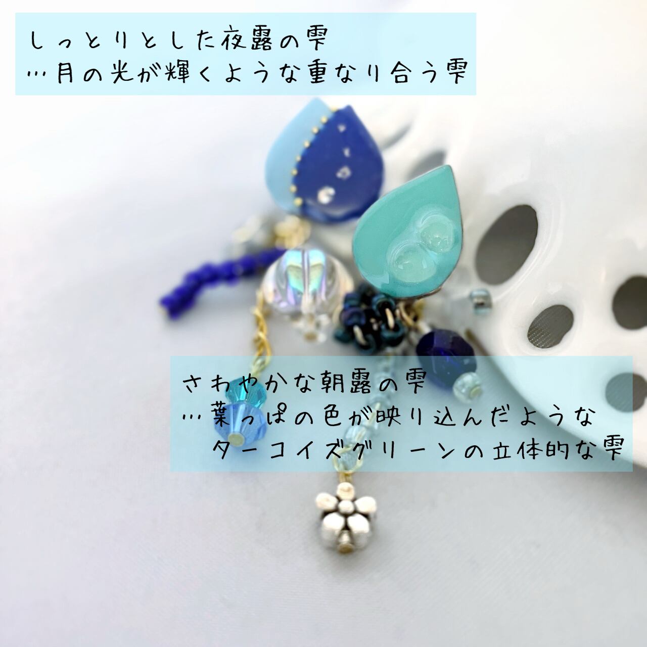 …葉っぱの色が映り込んだような、ターコイズグリーンの立体的な雫。
