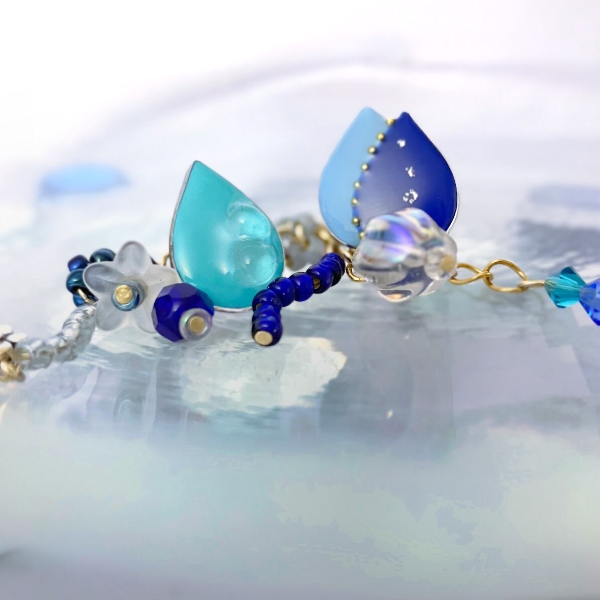 ・金具やビーズは 汗、皮脂、化粧品、経年変化等により変色します。ご使用後は柔らかい布等で優しくお手入れする事をおすすめします。