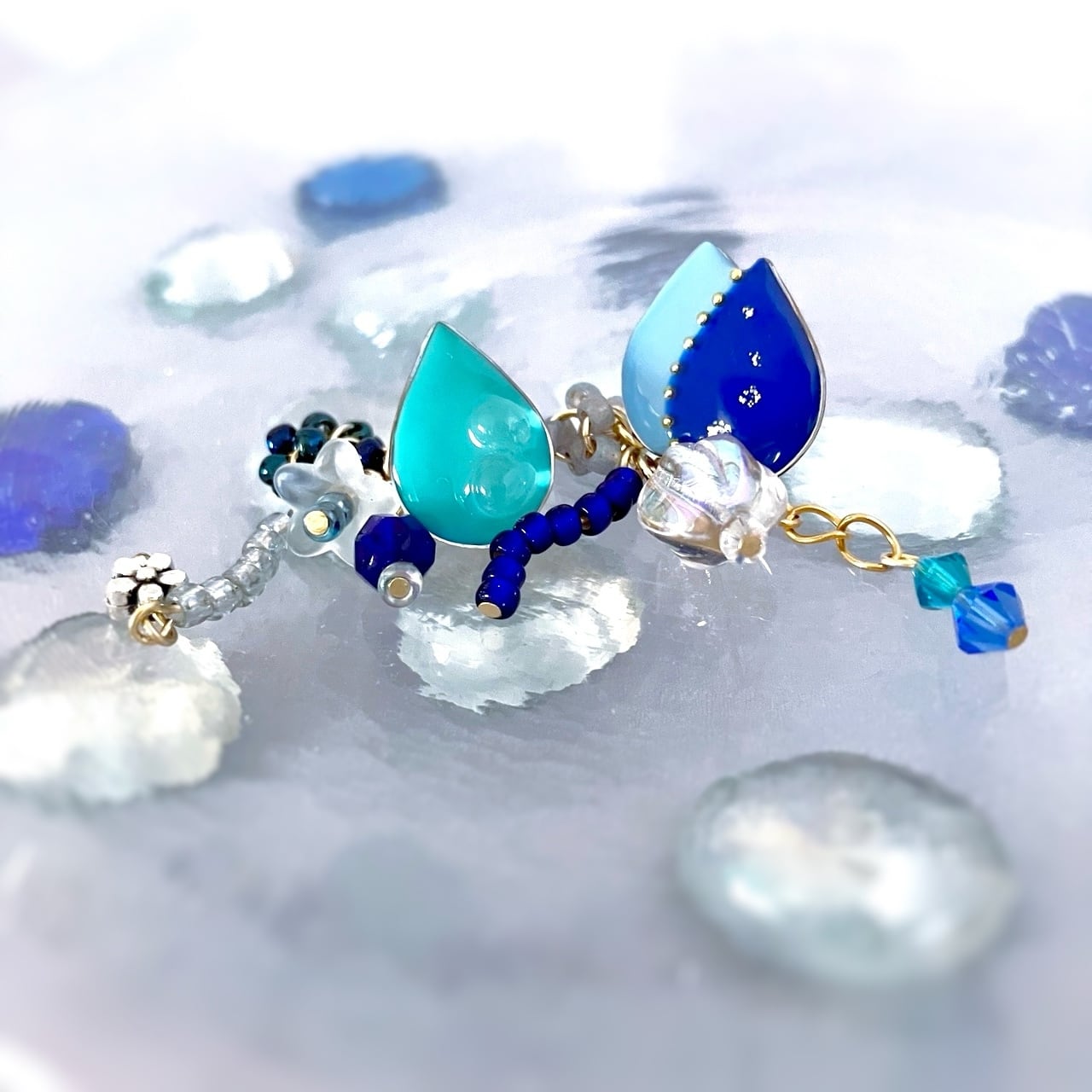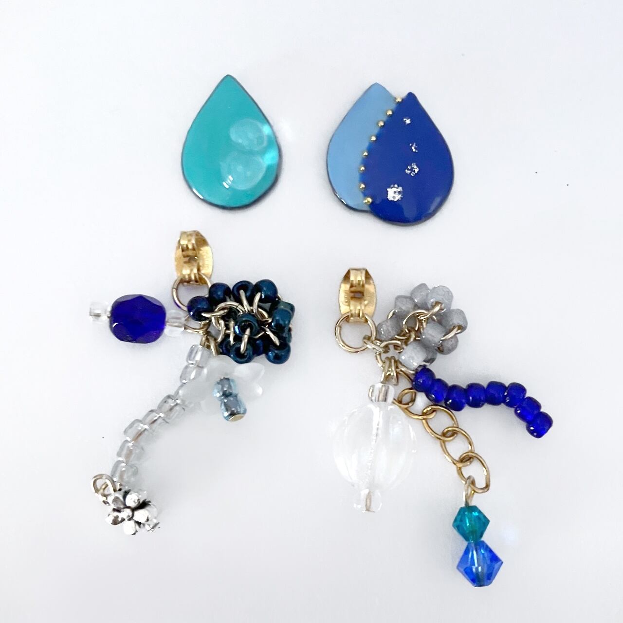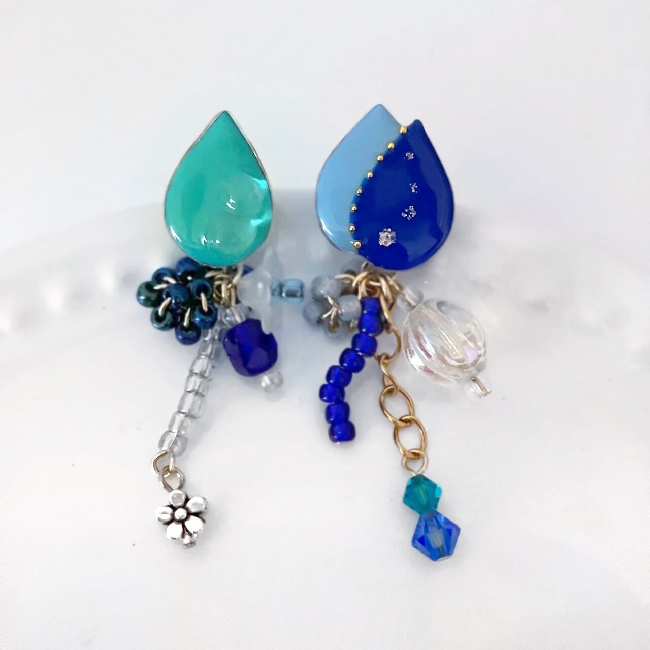 イヤリングのビーズは取り外し可能な金具に付いています。ピアスのビーズはキャッチに取り付けました。