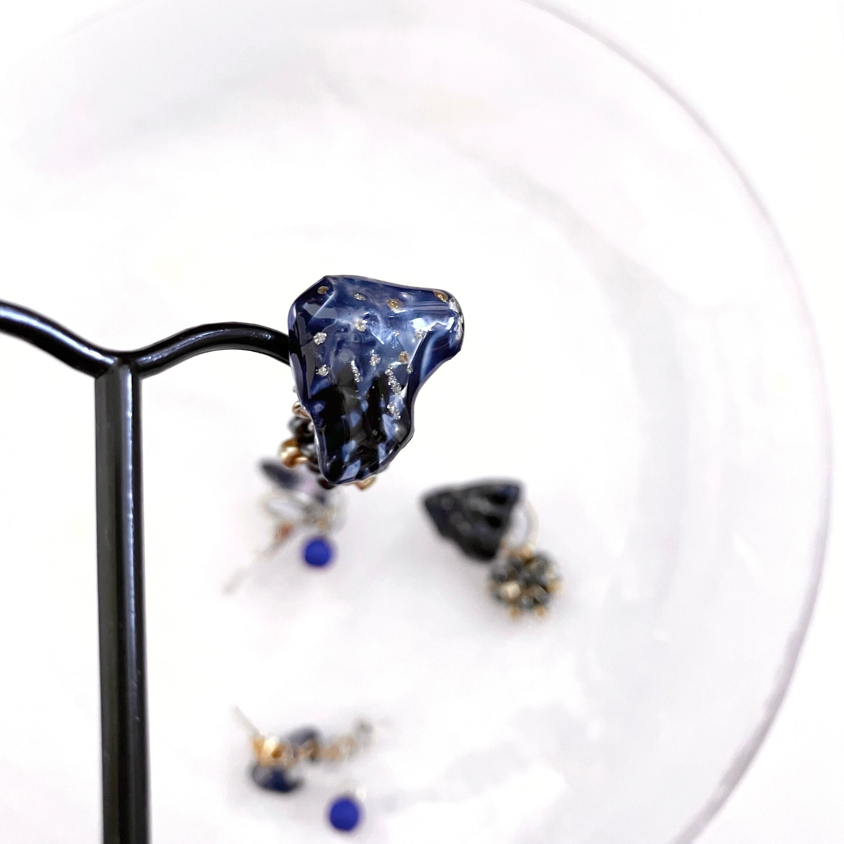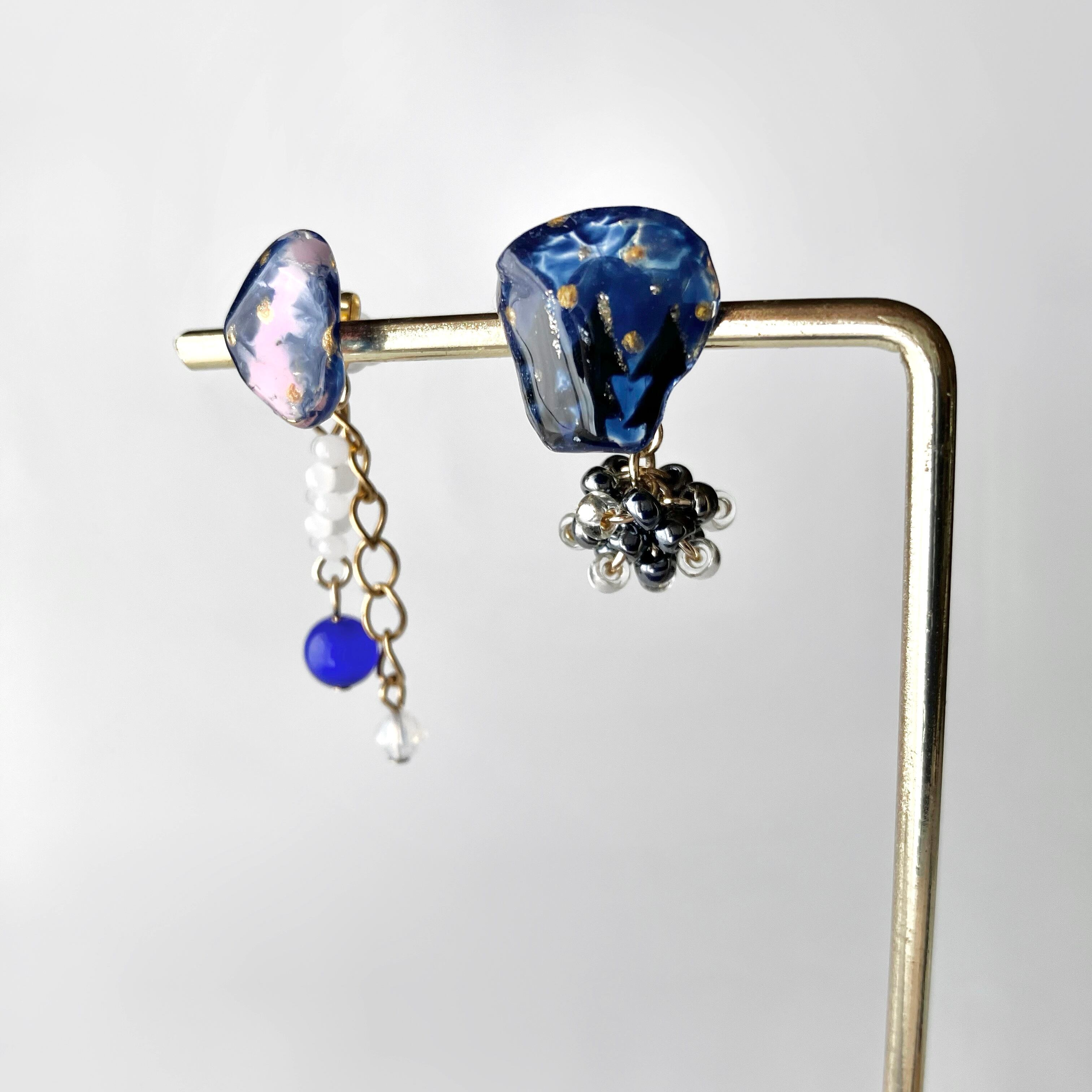 また、鮮やかなブルーのビーズ、チェーンやクリスタルビーズで星降る様を表現しています。