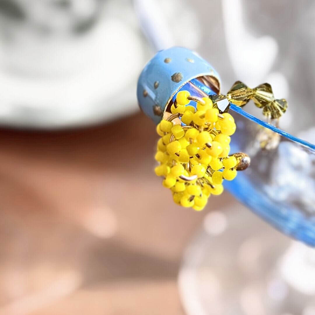 イエローのつぶつぶビーズとカーキのスワロフスキークリスタルで、可愛らしくデザインしました。