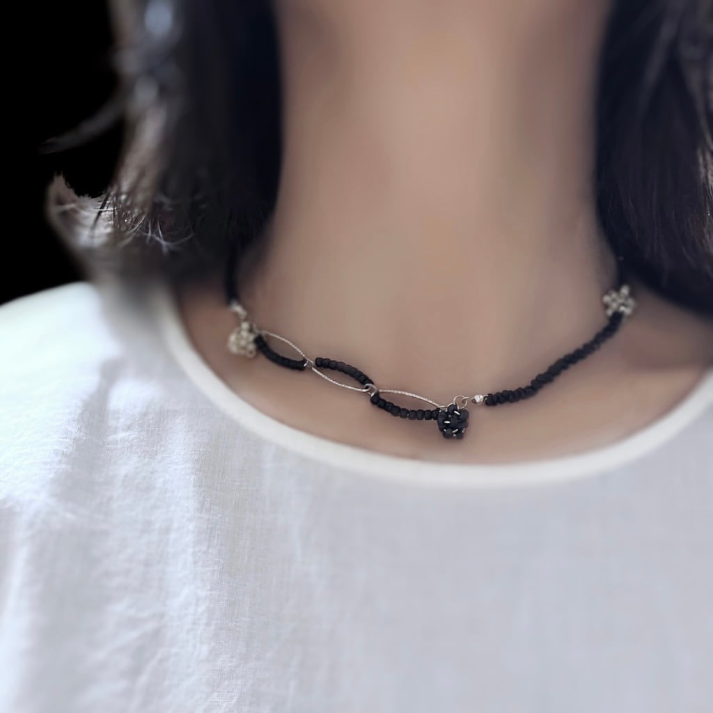 留める位置を変えて、チョーカーのように短くもお楽しみいただけます。