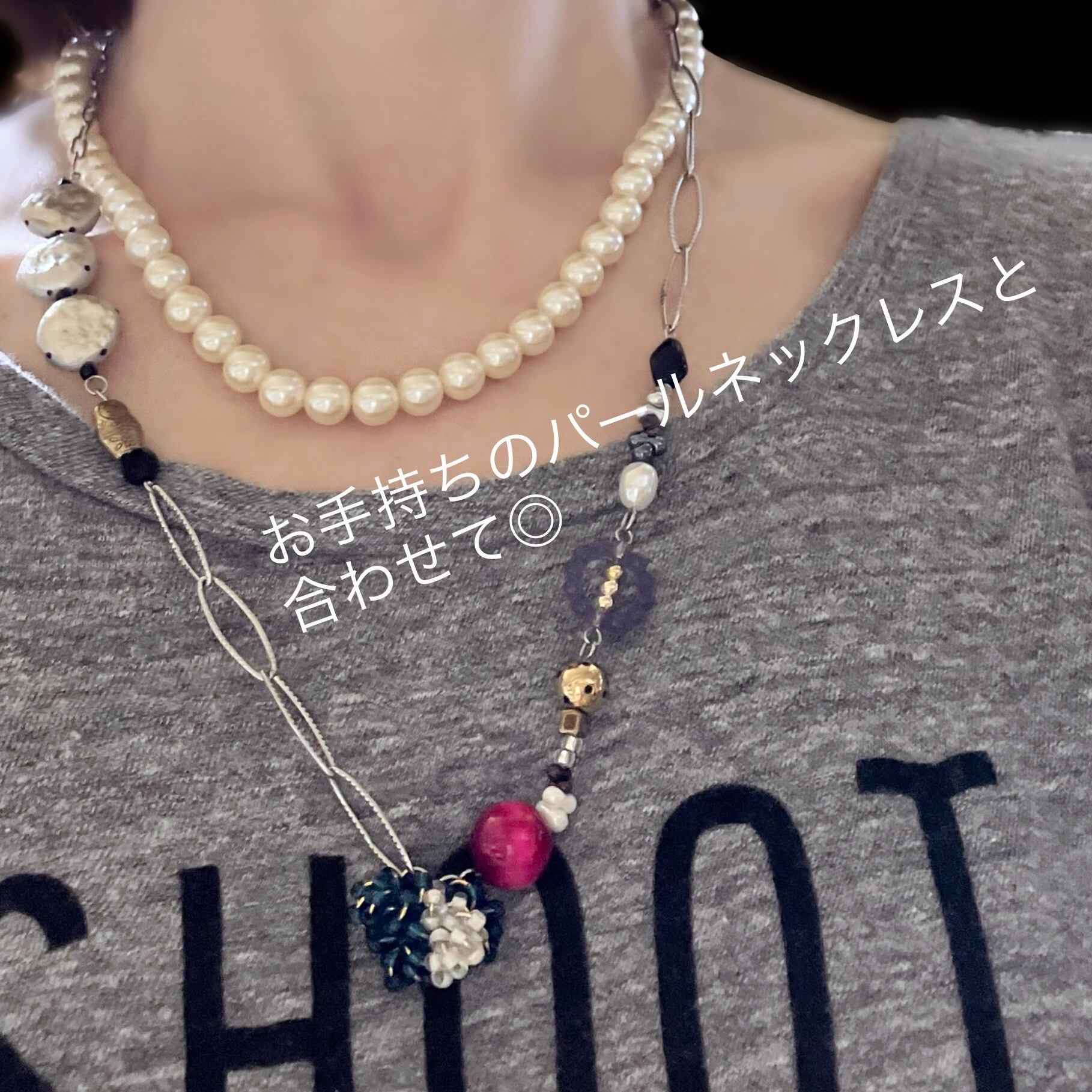 ゴールドやパール等のショートネックレスと重ね付けしてもおしゃれです。