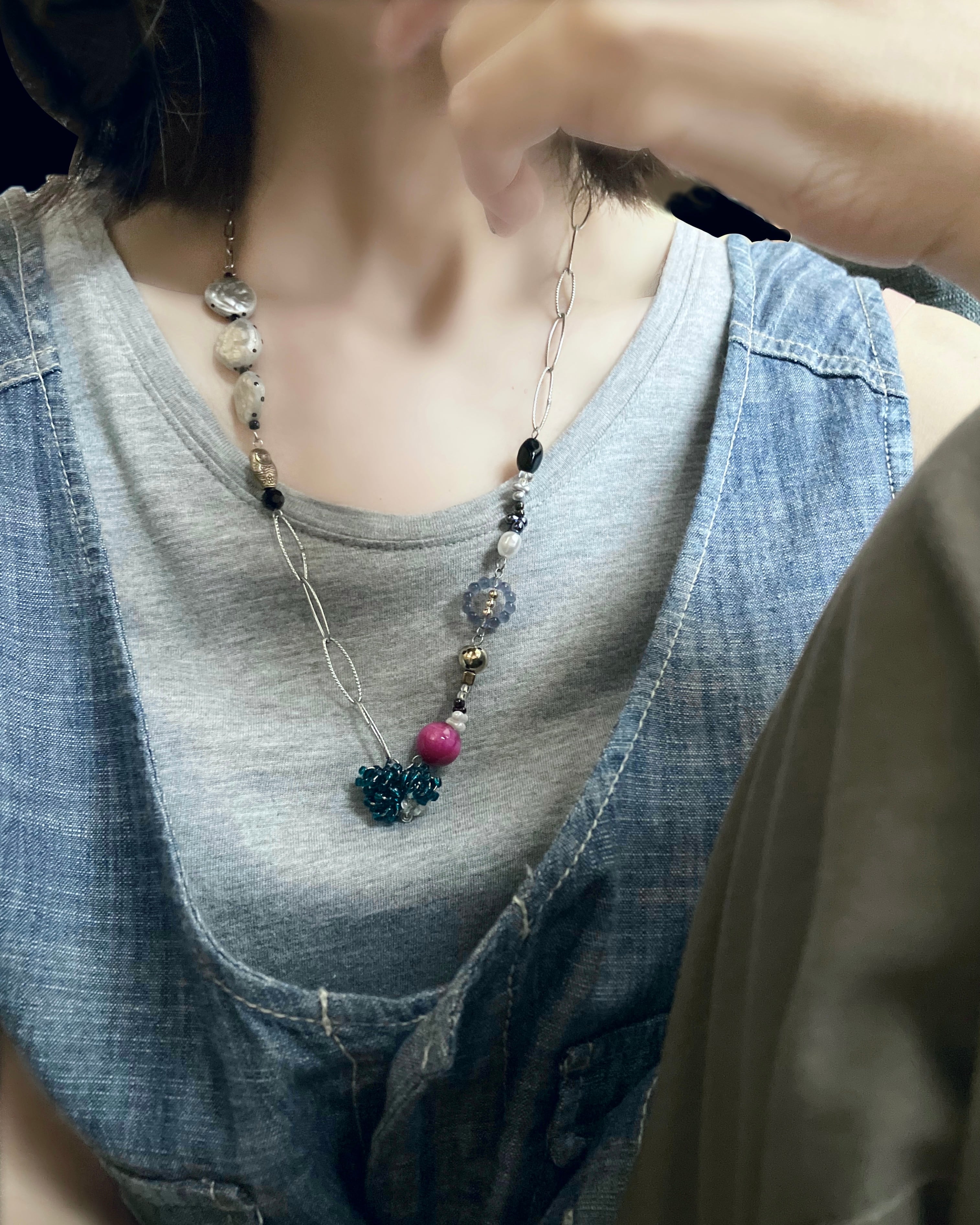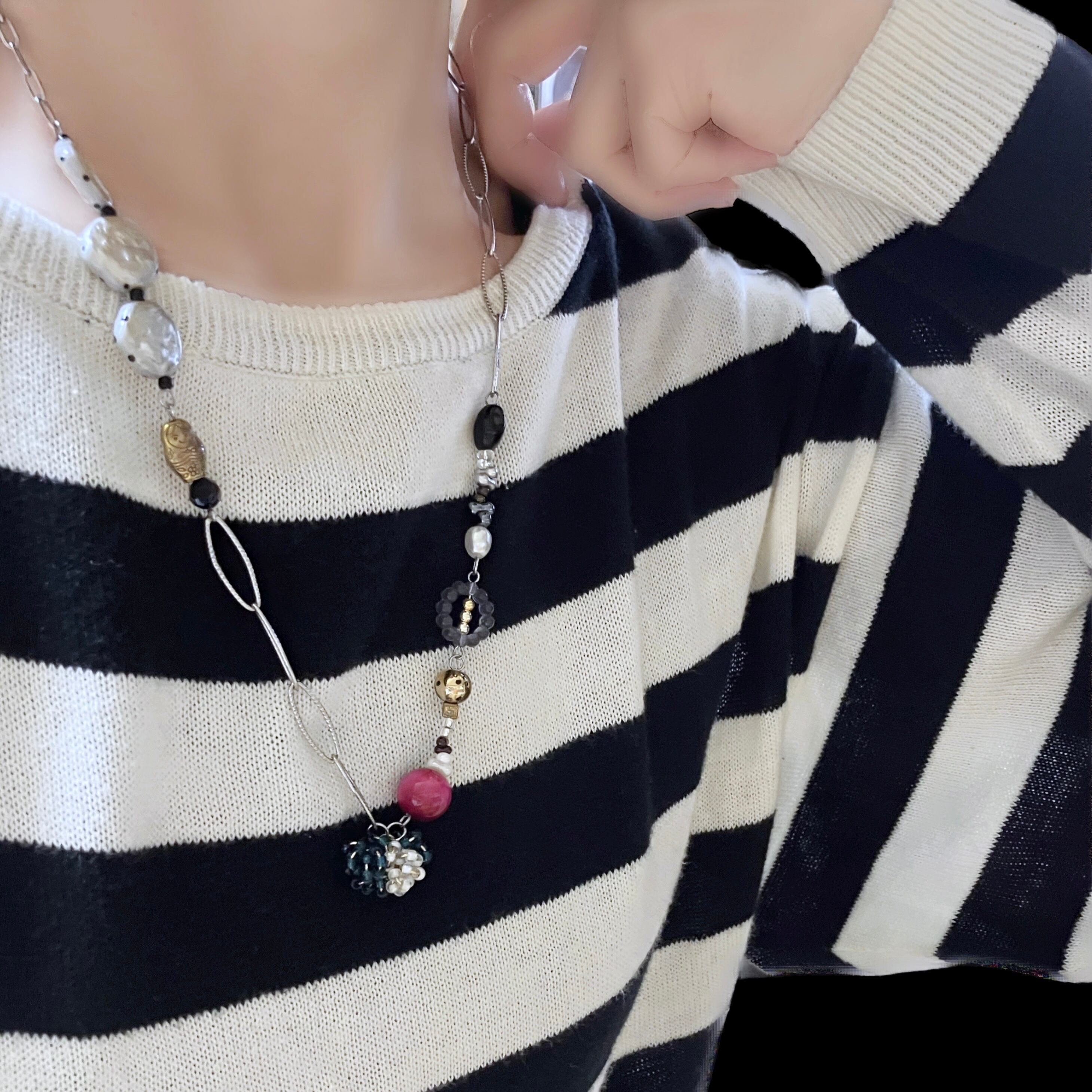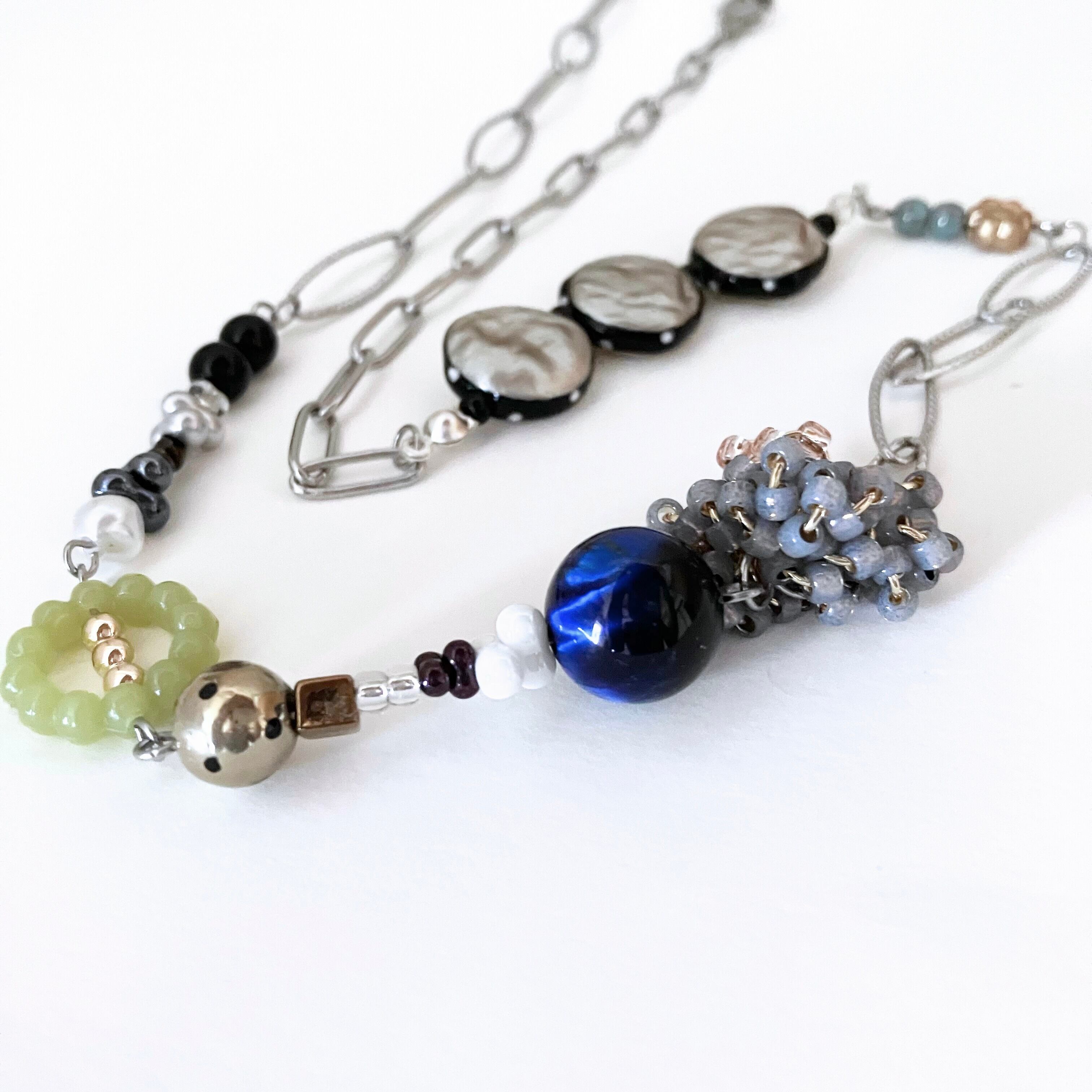 カラービーズを合わせた個性的なネックレス。