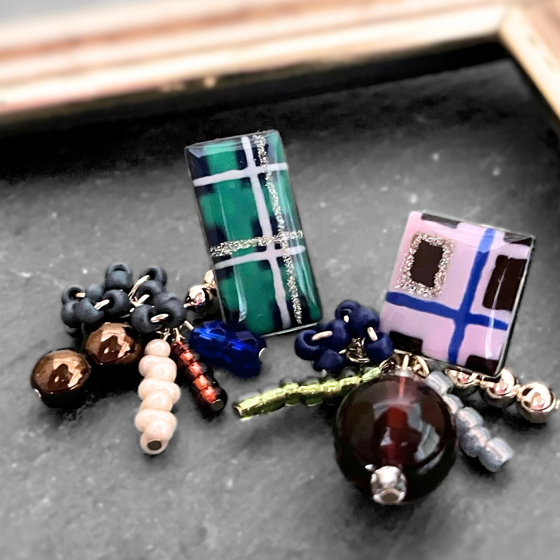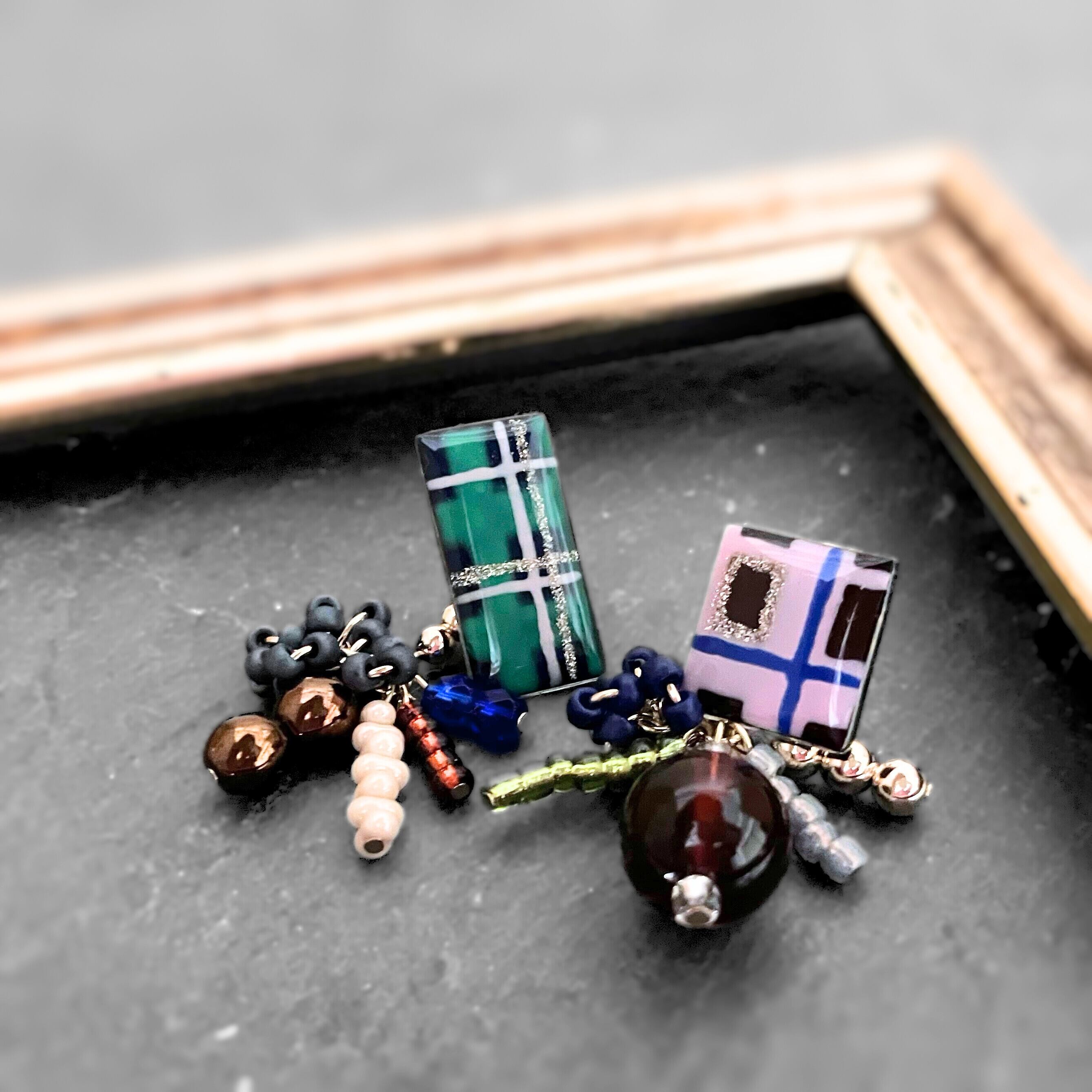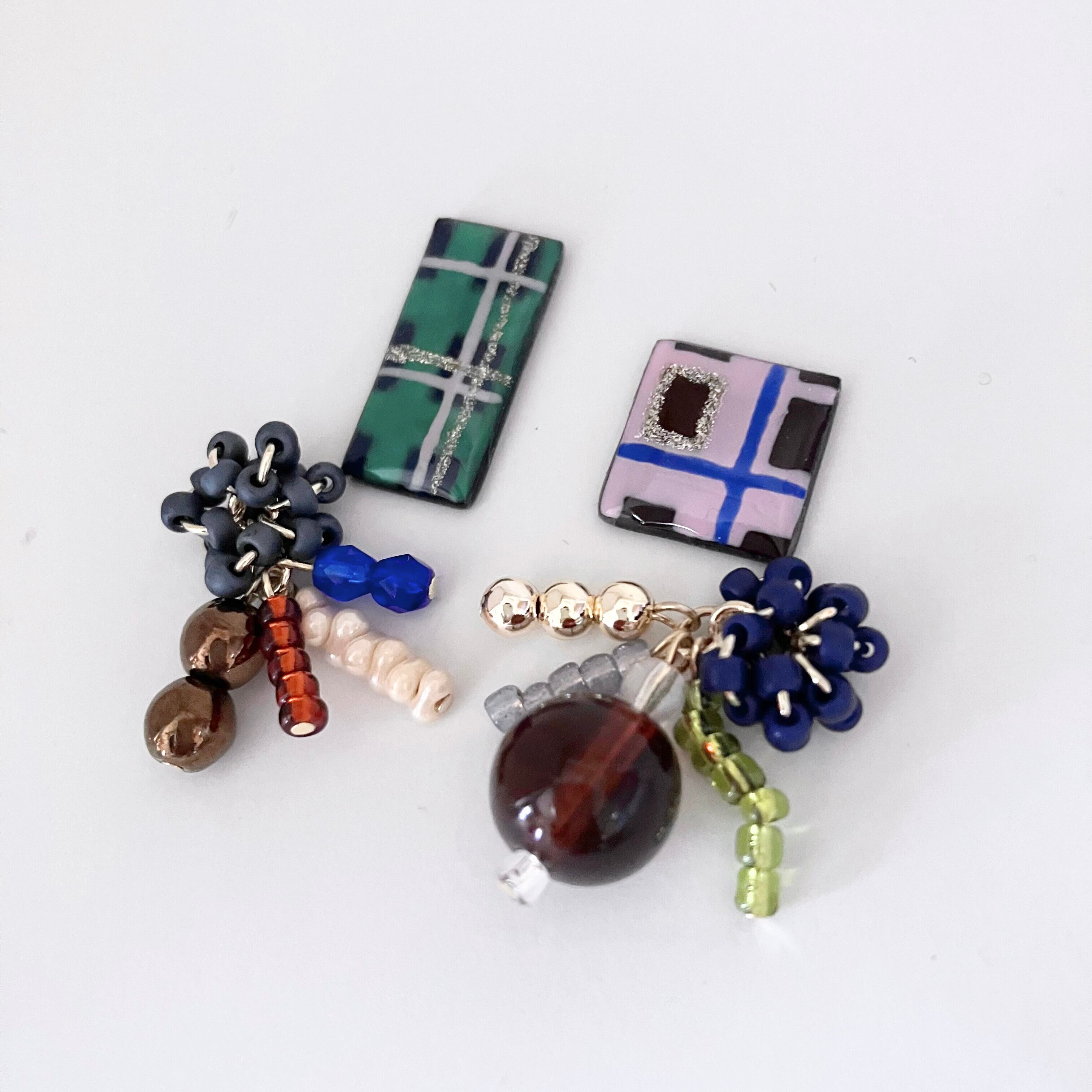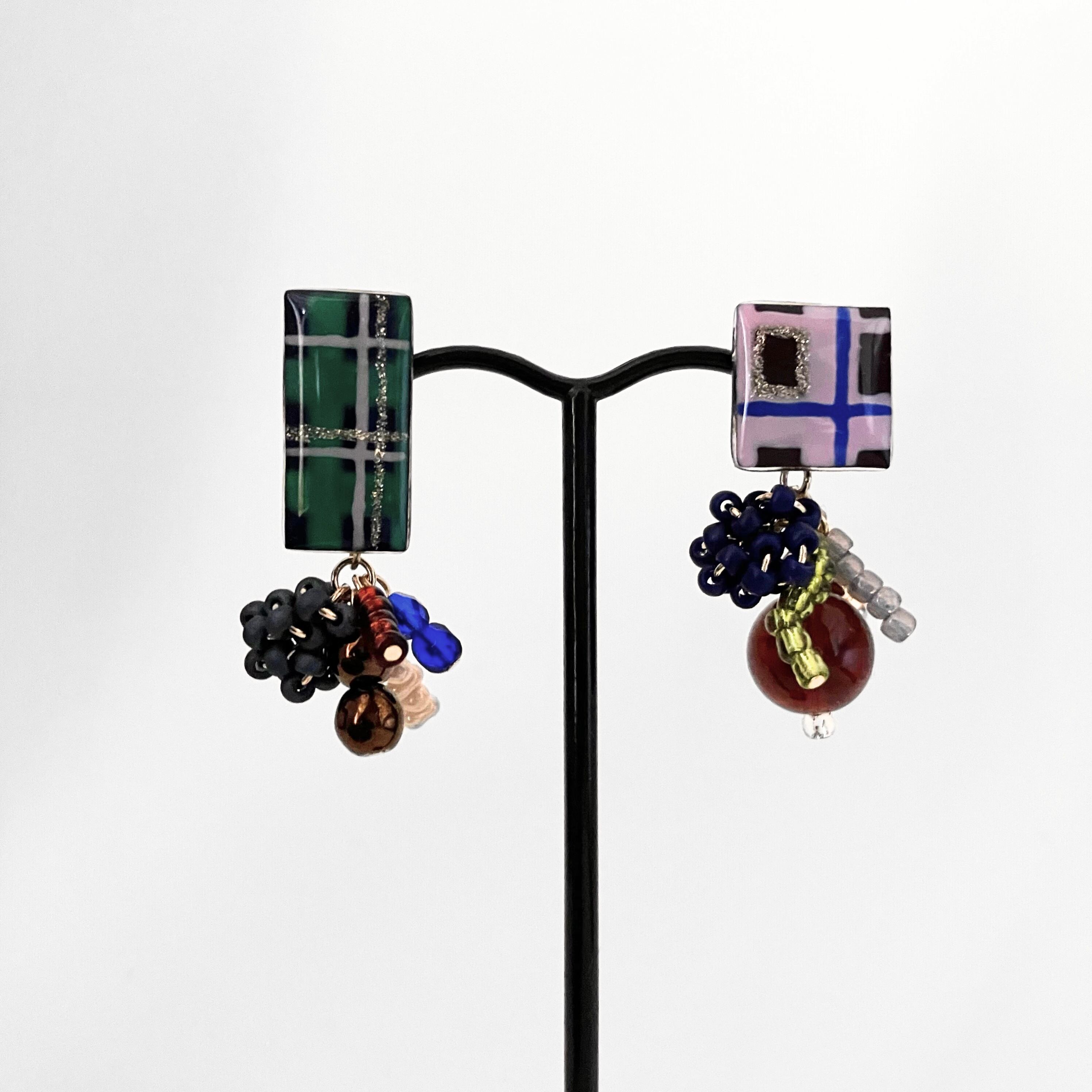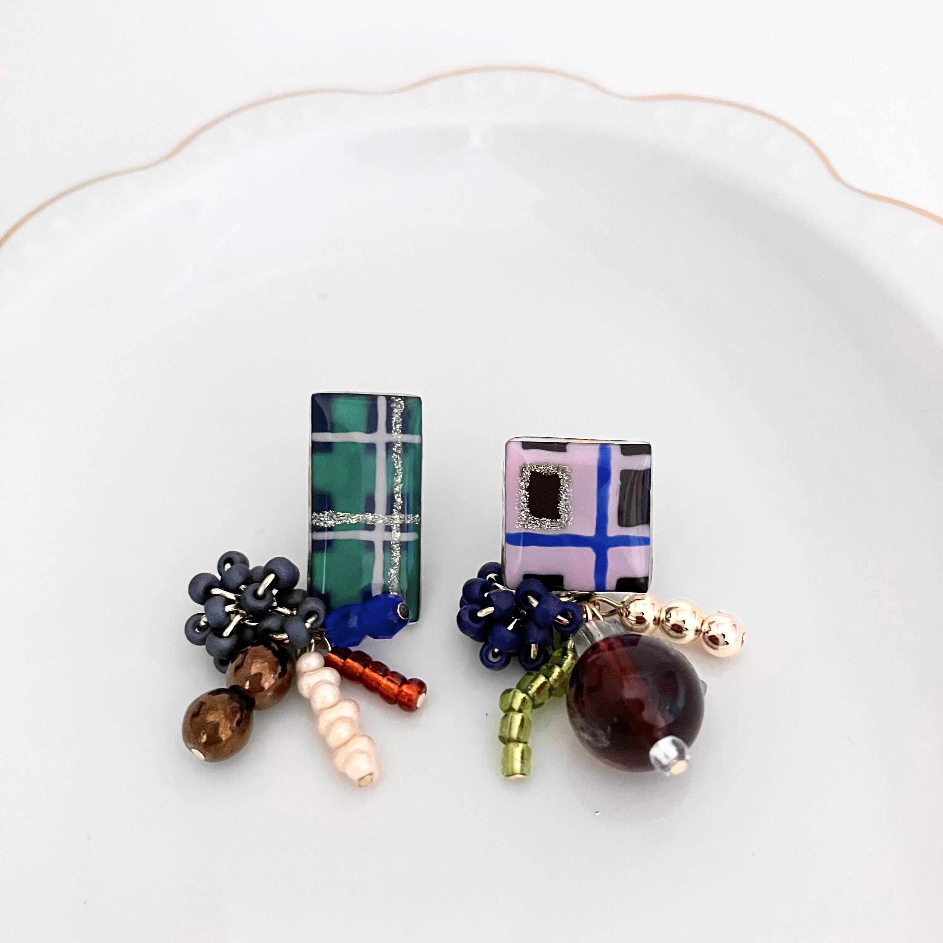 長方形と正方形、小さな四角の中におしゃれなチェックを描いた耳飾りです。