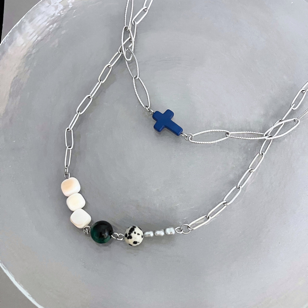 2本同じシルバーカラーのチェーンですが、それぞれ形状が異なる点もおしゃれポイントです。一本使いでも存在感があります。