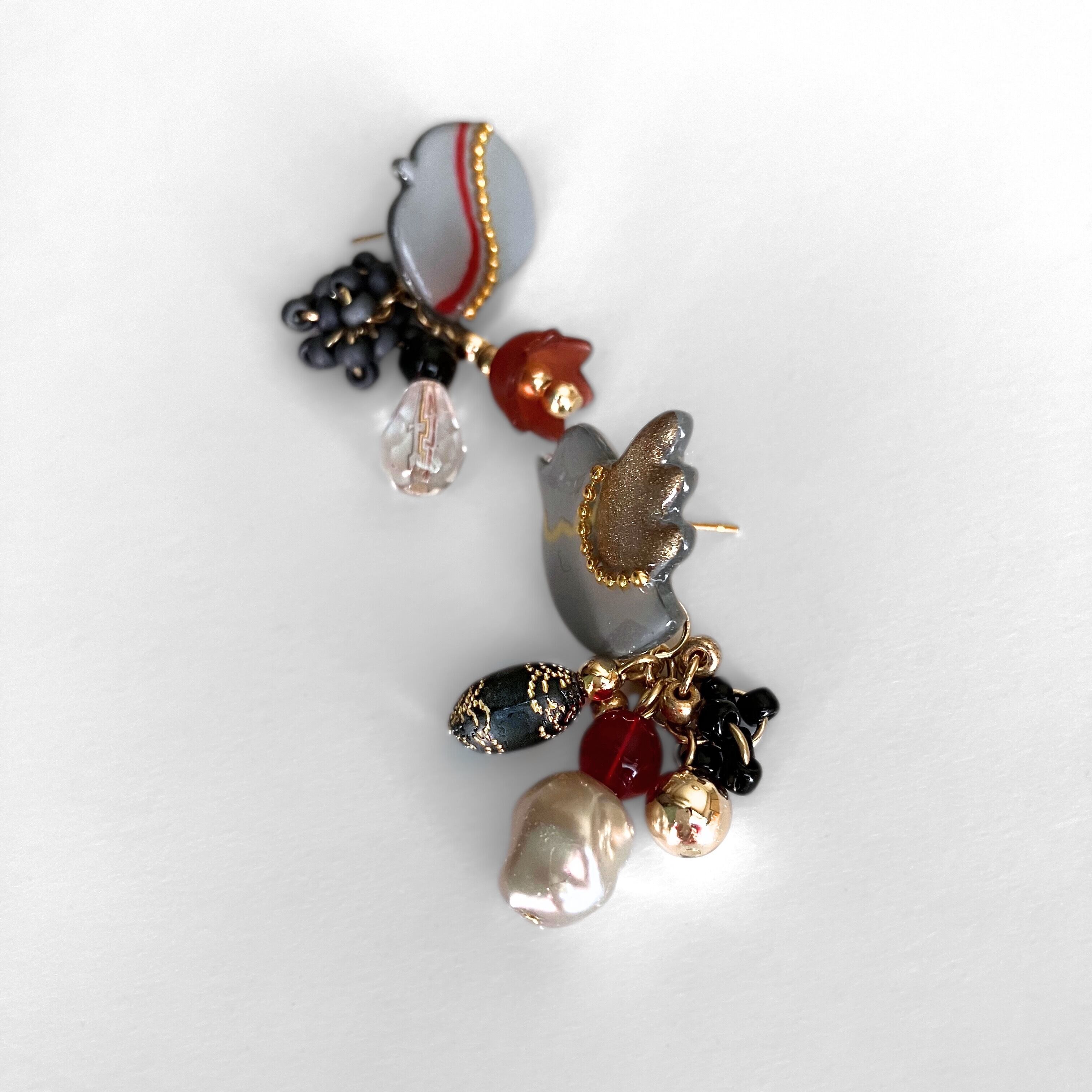 つぶつぶビーズや、お花型、雫型、アーモンド形、イビツ型等、動きのある印象的なビーズを揺らしています。