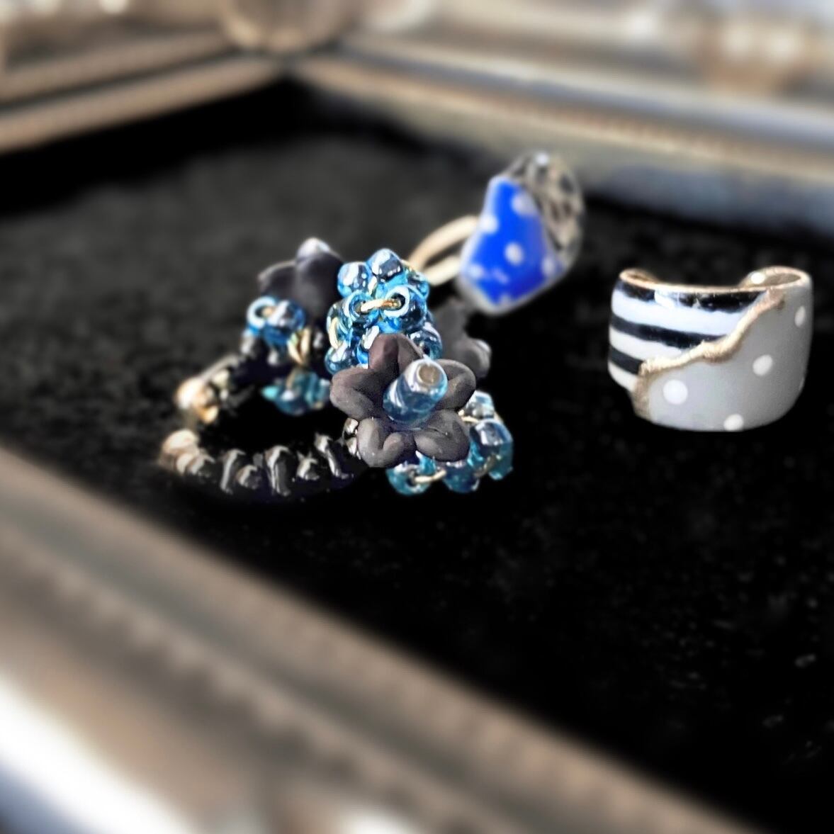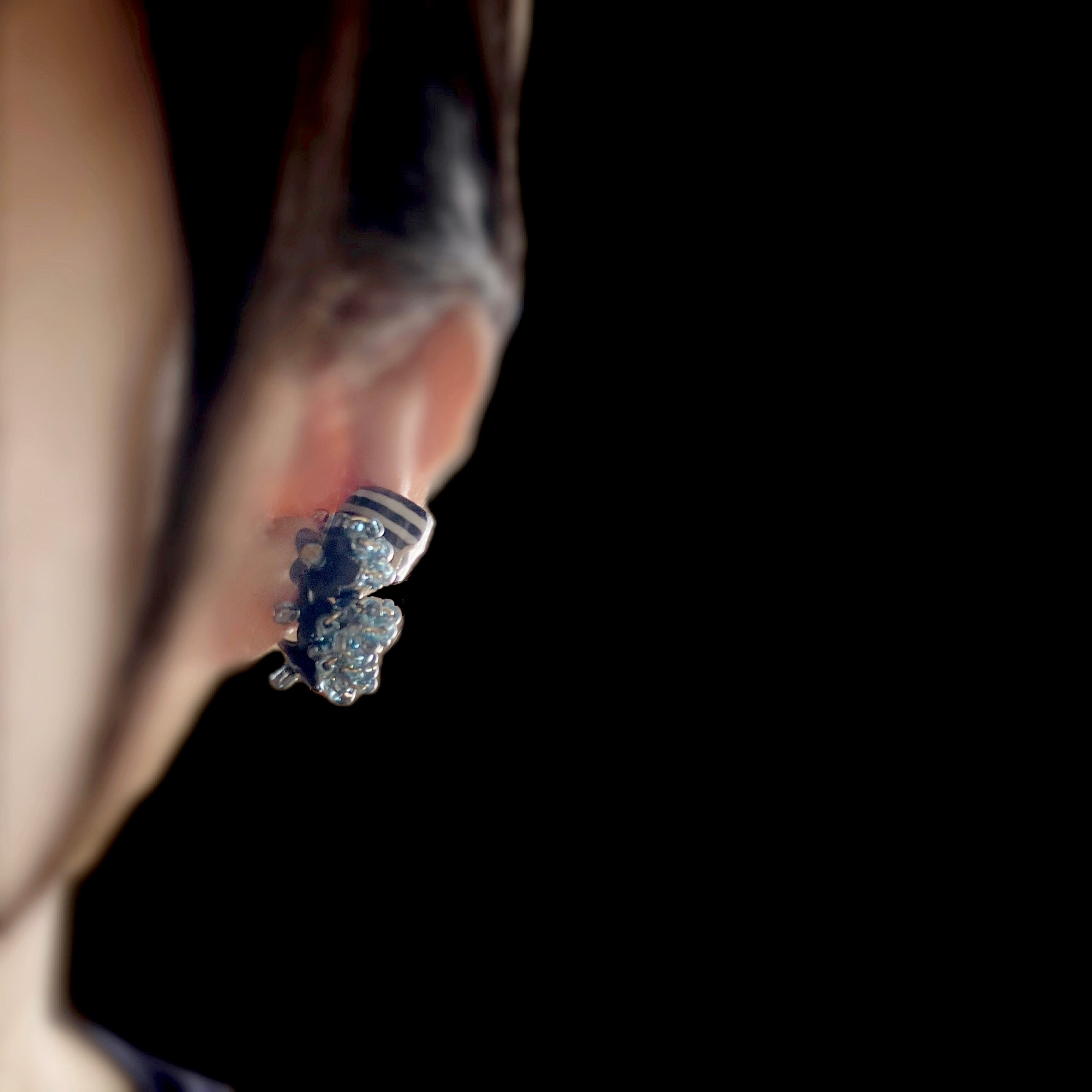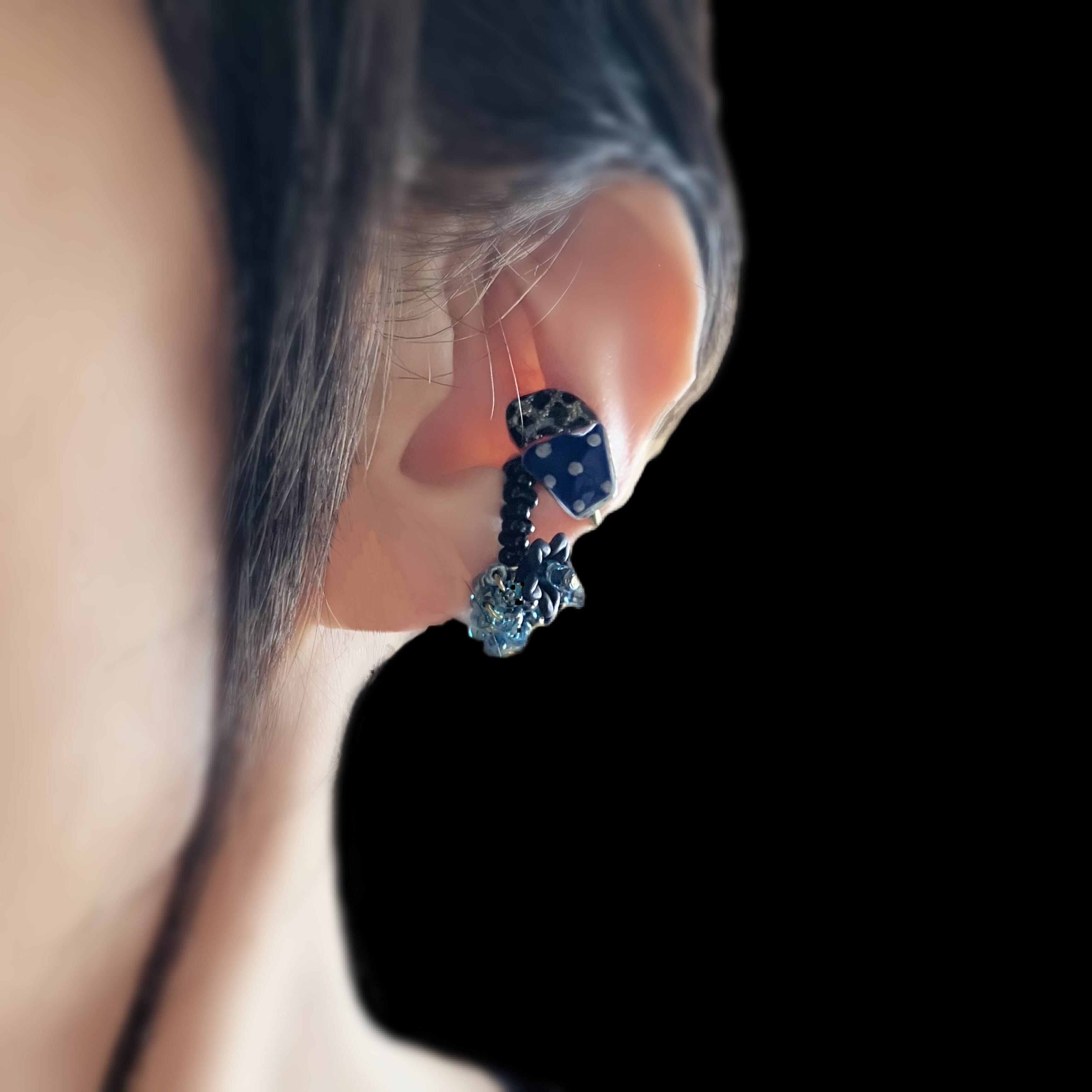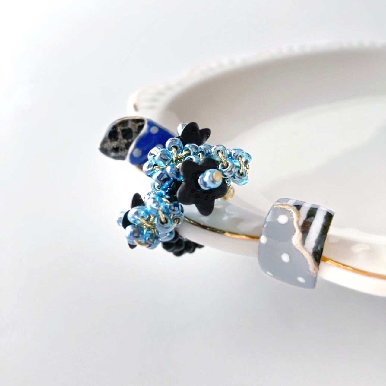 ② 黒いお花型のビーズとブルー系のつぶつぶビーズで構成した甘辛のイヤーカフ。