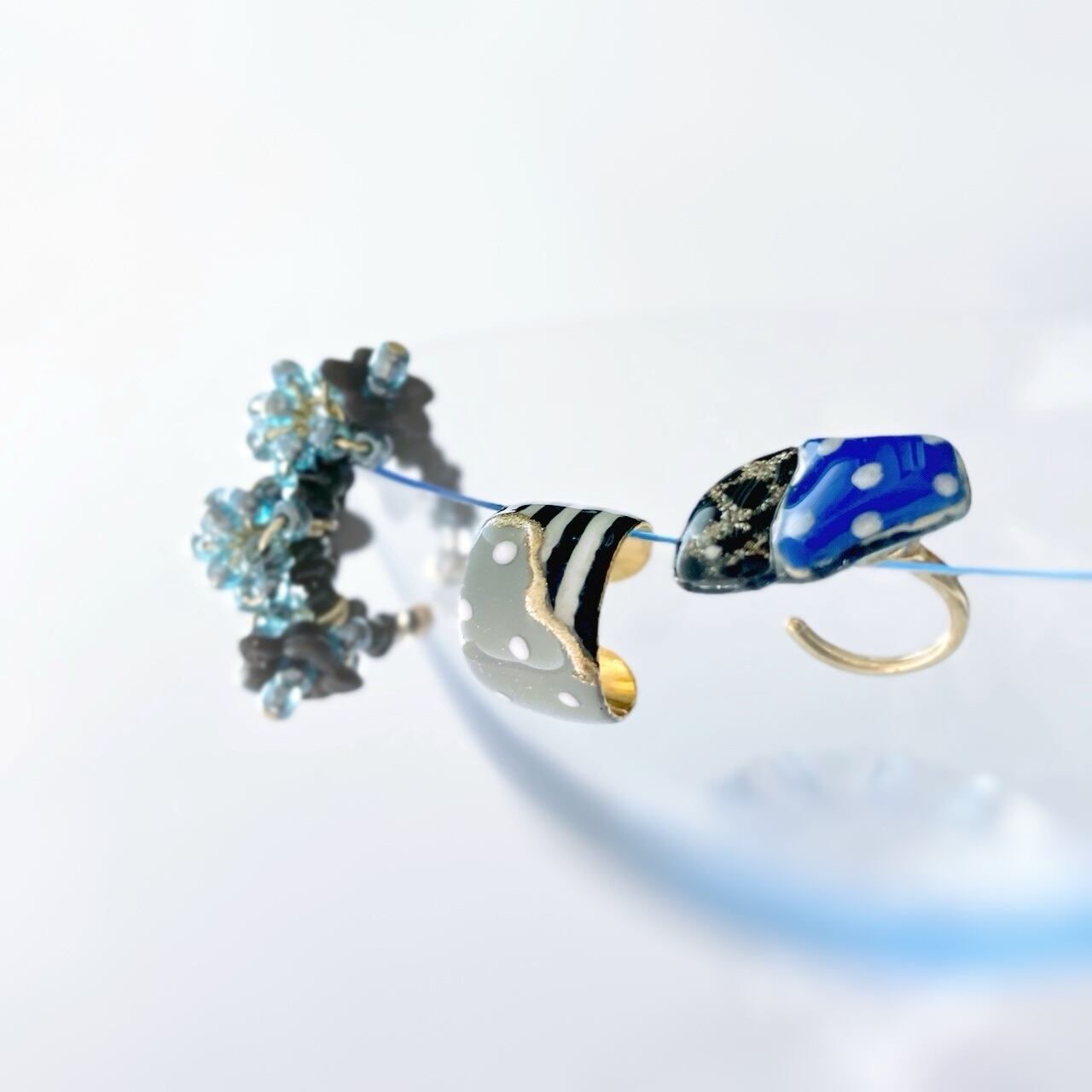 ①ボーダー×ドットをペイントしたクールキュートなイヤーカフ。ポップで遊び心あふれる仕上がりです。