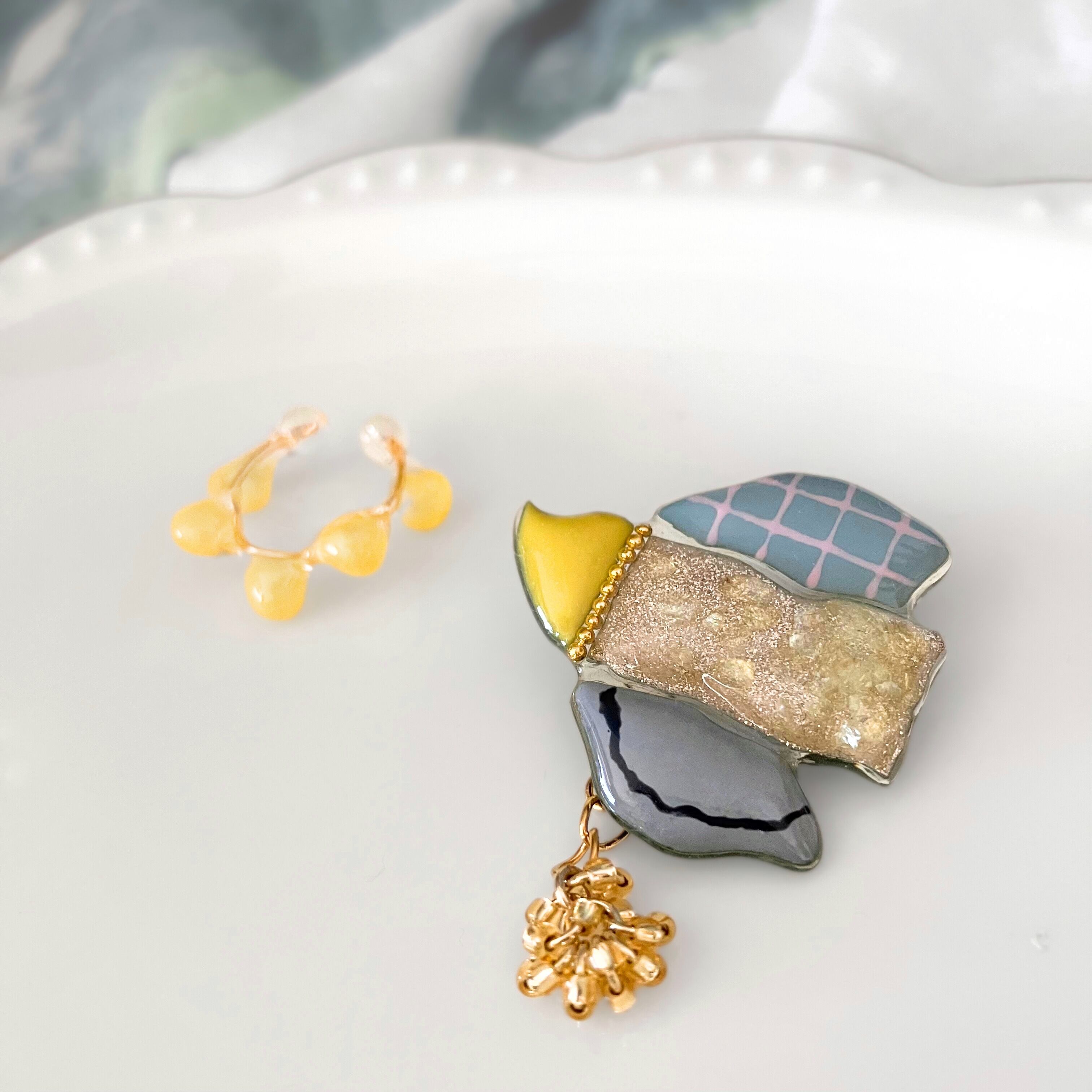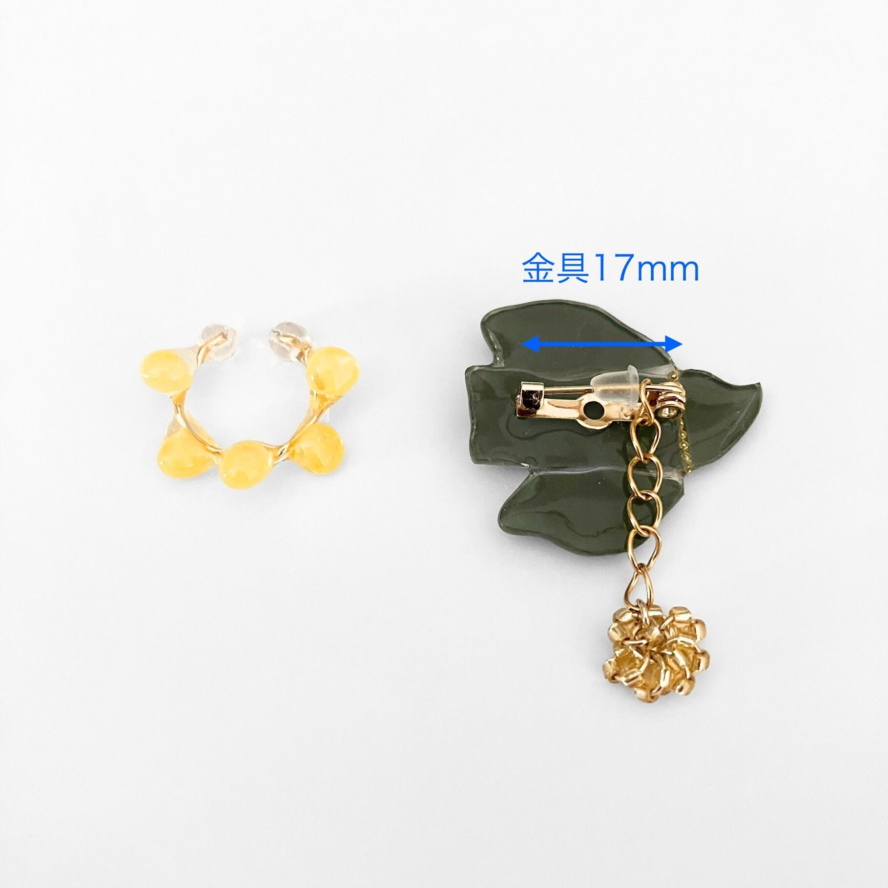 春の訪れを告げるミモザモチーフのブローチとイヤーカフセット。